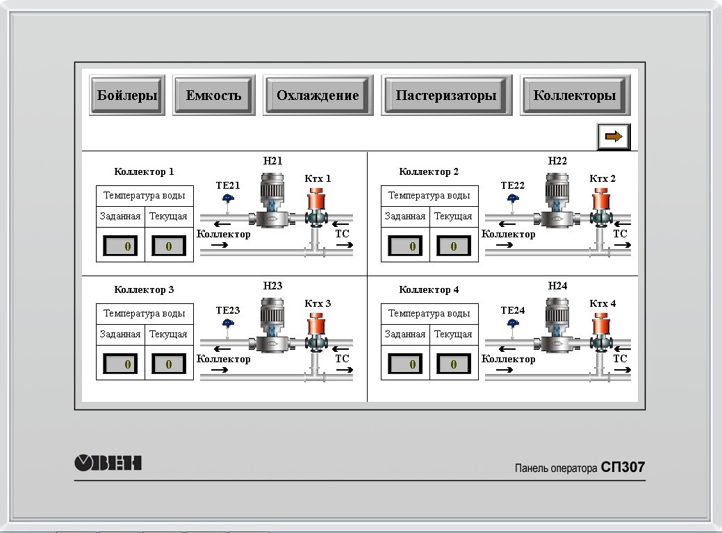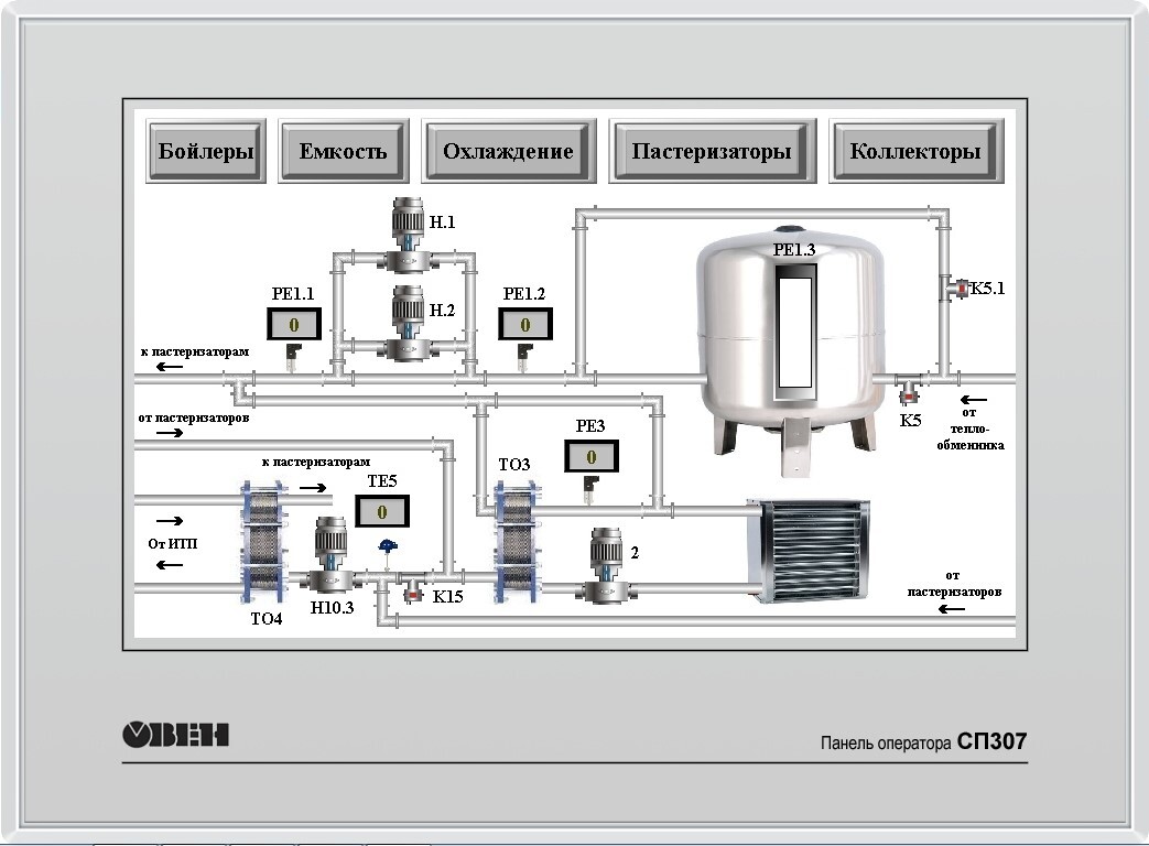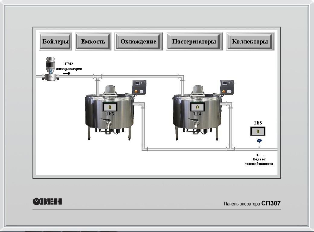 Для реализации местного щита управления применялись сенсорные панели оператора фирмы ОВЕН. Программирование панелей оператора и разработка видео кадров, так же выполнялась нашими специалистами. При помощи местных панелей оператора, обслуживающий персонал получил возможность контролировать процессы дойки, пастеризации, охлаждения молока, управлять СИП мойкой и другими вспомогательными системами. Так же местные панели позволяют управлять скребками очистки пола.